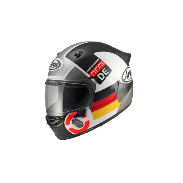 Casco Arai Quantic. El Quantic es el compañero ideal para los motoristas sport-touring que exigen una combinación perfecta entre rendimiento y comodidad. Arai ha aplicado en él sus tecnologías más avanzadas como la pantalla VAS, un avanzado sistema de ventilación que destaca por una entrada de aire en el logotipo frontal 3D y los acolchados interiores FCS. Destaca por el nuevo certificado estándar ECE22/06 y dispone de una base 5mm más ancha para ofrecer mayor confort. Destaca también su forma suave y redonda muy aerodinámica diseñada principalmente para "rebotar" y distribuir las fuerzas de impacto.