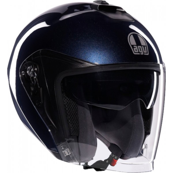 Casco AGV Irides. Casco tipo jet ideal para moverse en la ciudad fabricado con resina termoplástica de alta calidad y resistencia. Dispone de una amplia pantalla que permite tener un gran campo de visión y se puede configurar en varias posiciones. Predisposición para instalar Pinlock® 70. Visor solar para la protección de los rayos UV, desmontable sin necesidad de utilizar herramientas. Sistema de ventilación mediante entrada de aire ajustable en la parte superior de la calota y extractor de aire en la parte trasera. Acolchados interiores Dry Speed desmontables y lavables. Almohadillas de las mejillas intercambiables. Compatible con el uso de gafas y predisposición para instalar intercomunicador (no incluido). Cierre micrométrico.