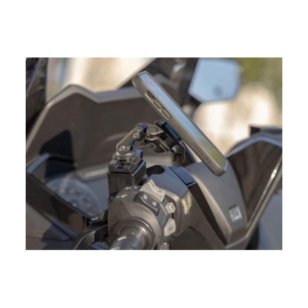 El cabezal de indexación se puede inclinar y el brazo tiene múltiples puntos de giro, lo que le permite colocar su smartphone en el ángulo de visión óptimo, sin interferir con los controles de su scooter o moto.