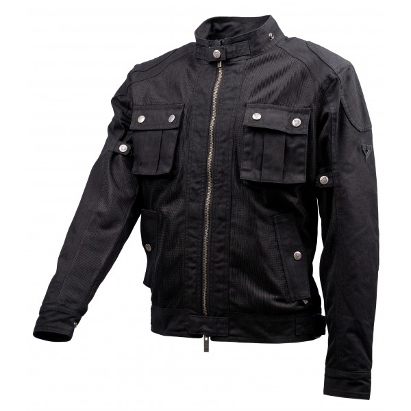 Chaqueta de moto para hombre fabricada en tejido de malla perforada y algodón encerado con material reflectante en el cuello. Incluye 4 bolsillos exteriores y 2 interiores. Ajustable en cintura, brazos y cuello, con cremallera central YKK de doble cursor. Bolsillo protector de espalda (protección no incluida) y protecciones desmontables “Flexishock” en codos y hombros, certificadas EN1621-1: 2012 CE Nivel 2.