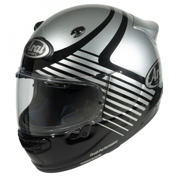 Casco Arai Quantic. El Quantic es el compañero ideal para los motoristas sport-touring que exigen una combinación perfecta entre rendimiento y comodidad. Arai ha aplicado en él sus tecnologías más avanzadas como la pantalla VAS, un avanzado sistema de ventilación que destaca por una entrada de aire en el logotipo frontal 3D y los acolchados interiores FCS. Destaca por el nuevo certificado estándar ECE22/06 y dispone de una base 5mm más ancha para ofrecer mayor confort. Destaca también su forma suave y redonda muy aerodinámica diseñada principalmente para "rebotar" y distribuir las fuerzas de impacto.